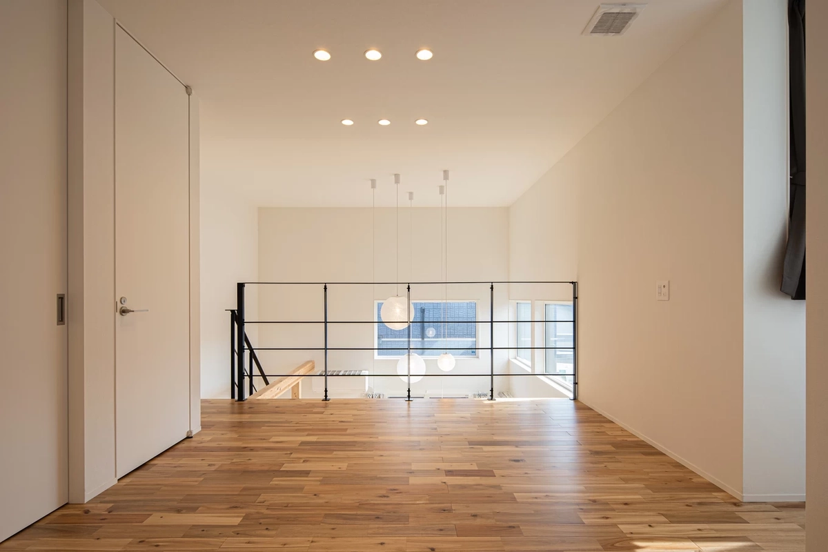 吹き抜けに面した開放的なフリースペース。現在は趣味や愛犬と過ごす「セカンドリビング」として、将来は壁を立てて個室に仕切ることも可能。寝室や子供部屋にプラスしたこの「余白」が、家族の成長に合わせて柔軟に形を変えられます。