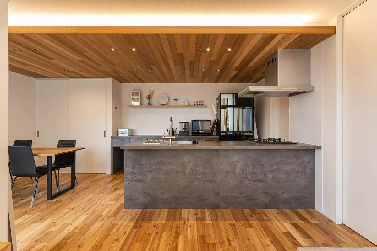 白を基調としたLDKに、板貼りの下がり天井でアクセント。空間をゆるやかに仕切ることで、キッチンがまるで洗練されたカフェやリゾートの厨房のような別空間になっています。
