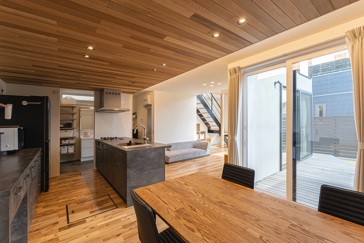 デッキ越しの庭までが、リビングとひとつの空間になっているかのような印象をあたえてくれる空間。リビングの方の窓からもダイニングの方の窓からもウッドデッキに出られるよう設計しています。