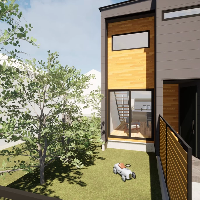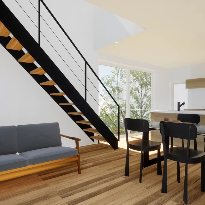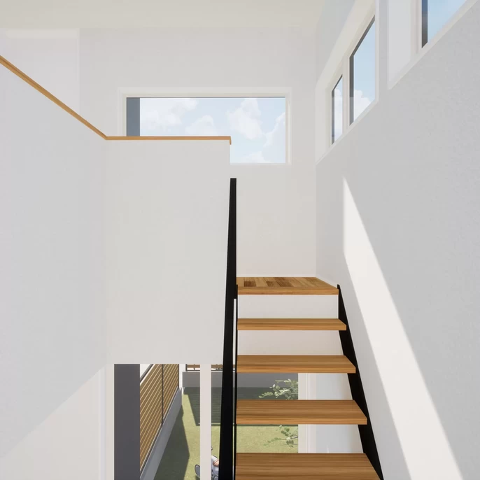 隣接するご実家とは程よい距離感を保つ設計に。光と風だけを招き入れ、守られた安心感の中で、気兼ねなく窓を開け放てる設計です。